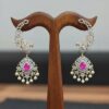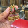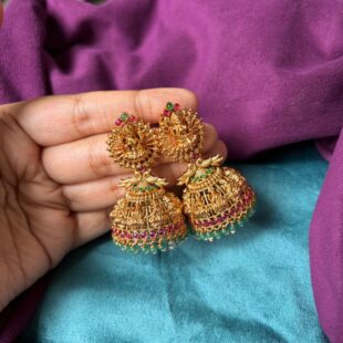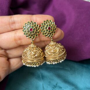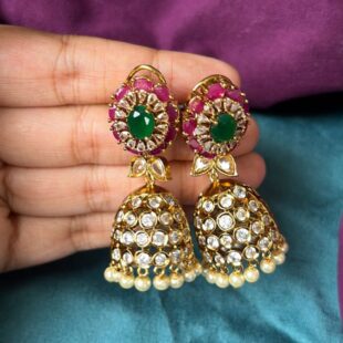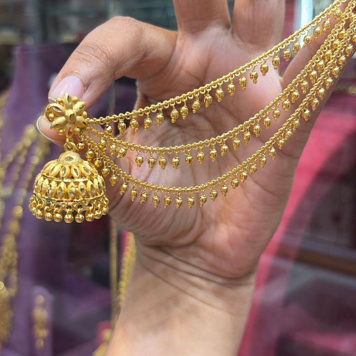 Gold Plated Jimiki With Ear Chain is designed with a rich gold-plated finish and a classic jimiki shape that gives a traditional and elegant look. The attached ear chain adds a graceful and grand touch to the overall design. Perfect for weddings and festive occasions, this piece pairs beautifully with sarees and ethnic wear, adding a bold and royal finish to your styling.