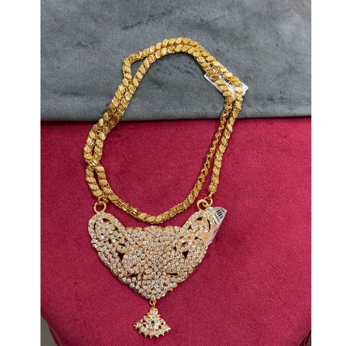 The Iympon dollar chain blends divine charm with modern elegance. Crafted in traditional five-metal mix, this chain often features a central dollar pendant embossed with Lakshmi, peacock, or floral motifs. It is lightweight, durable, and designed to resemble real gold.